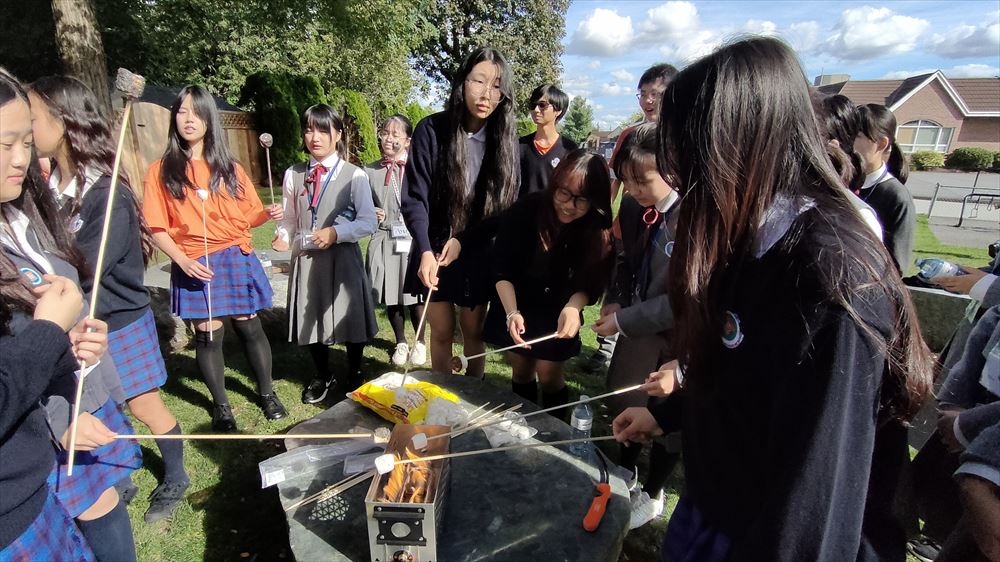 バディと別れたのち、ホストファミリーの迎えまでの間、ホスト校に留学生として学びに来ている生徒たちとスモア作りを楽しみました。ホスト校の先生によると、姫路女学院と同様に、カナダやアメリカへの大学進学を目指し、主に中国(台湾)や韓国から親元を離れ、入学してくる留学生が増えているそうです。