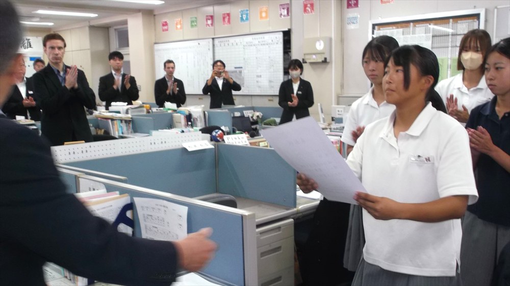 校長補佐の長谷川です。警報解除となった本日の昼休み、バレーボール部、ソフトボール部、陸上競技部の栄誉を職員室で讃えました。